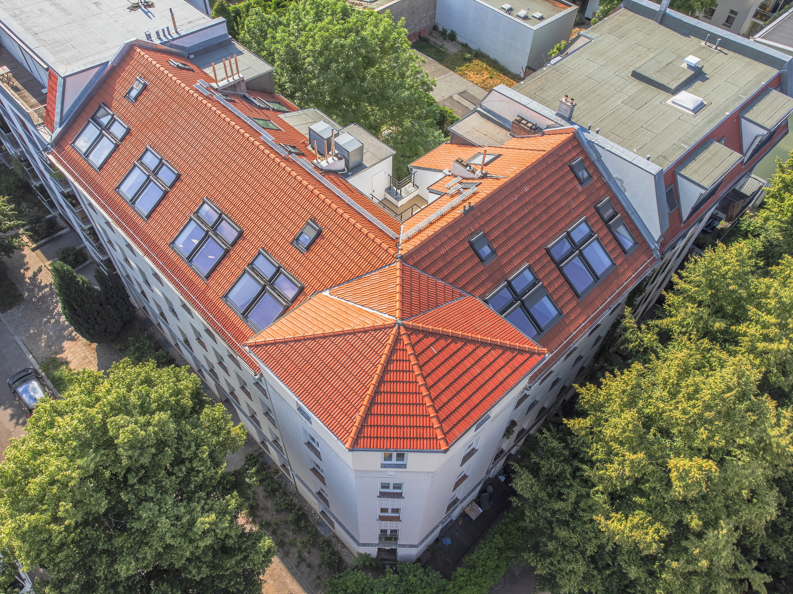 Diese exklusive Penthouse-Wohnung im Dachgeschoss (4. OG) eines historischen Altbaus von 1912 wurde 2024 fertiggestellt und vereint modernen Luxus mit dem Charme eines historischen Altbaus. Das Eckgebäude befindet sich an einer ruhigen Kreuzung und bietet einen offenen und unverbaubaren Blick auf einen benachbarten Spielplatz, der zur Erholung einlädt.