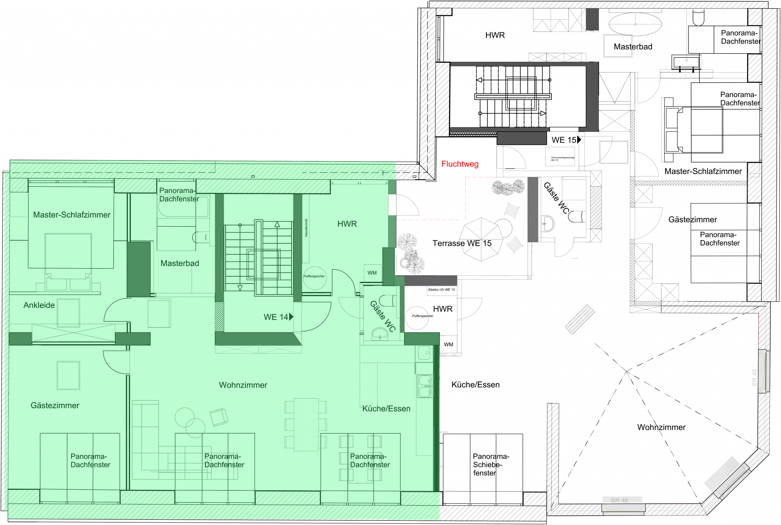 Die Wohnung wurde gerade fertiggestellt und besticht durch hochwertige Materialien und eine durchdachte Raumaufteilung. Der weitläufige Wohn- und Essbereich mit offener Küche ist das Herzstück der Wohnung und verfügt über riesige Panorama-Schiebefenster in den Dachschrägen, die den Raum mit natürlichem Licht durchfluten und einen atemberaubenden Süd-Ausblick bieten, wie man es sich in einem Penthouse vorstellt.