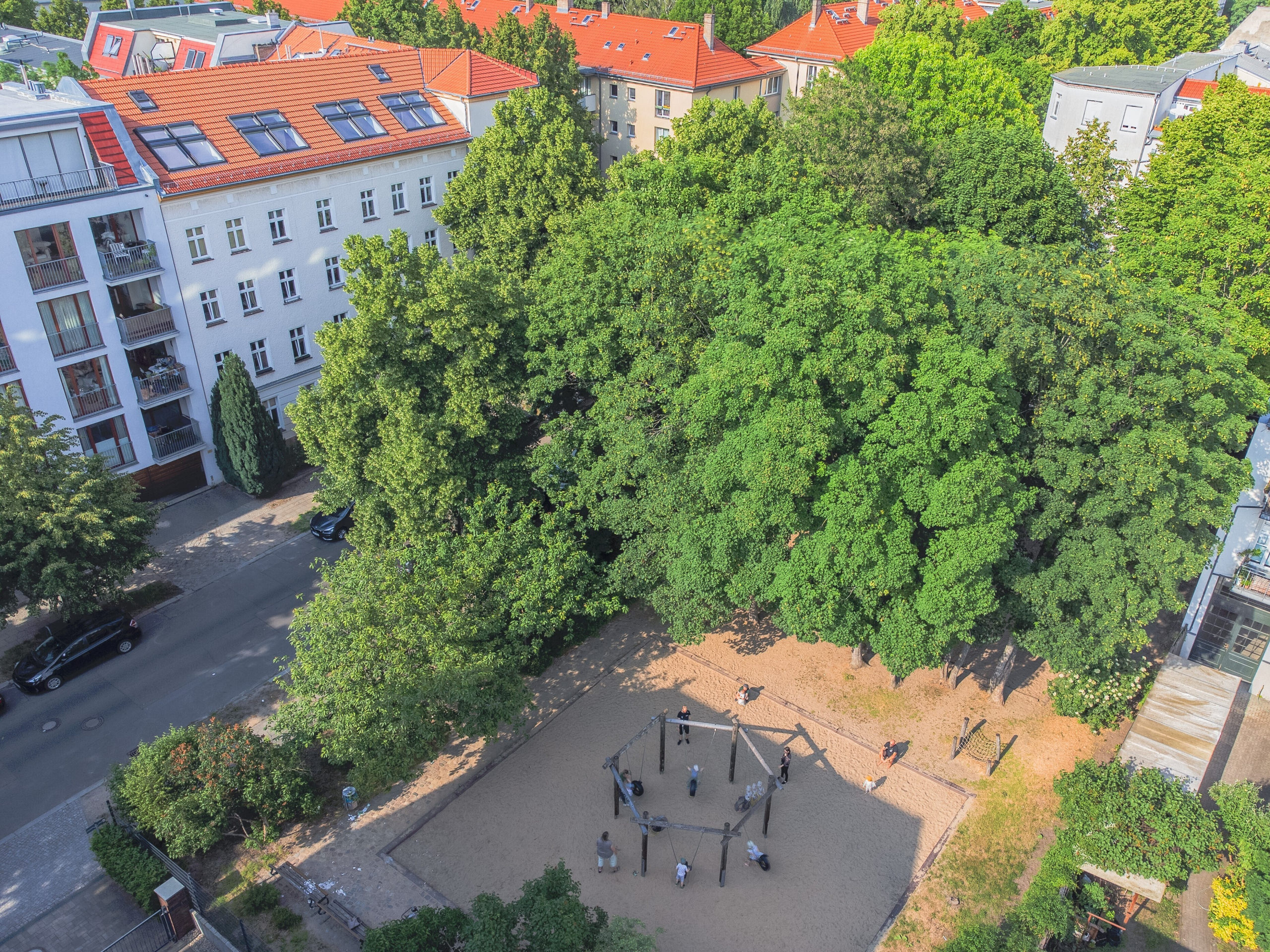 Besonders hervorzuheben ist die ruhige Lage der Wohnung an einer wenig befahrenen Kreuzung, die ein entspanntes Wohnen in der Großstadt garantiert. Der Blick auf den Spielplatz direkt gegenüber sorgt für eine angenehme Atmosphäre und bietet Erholung direkt vor der Haustür.