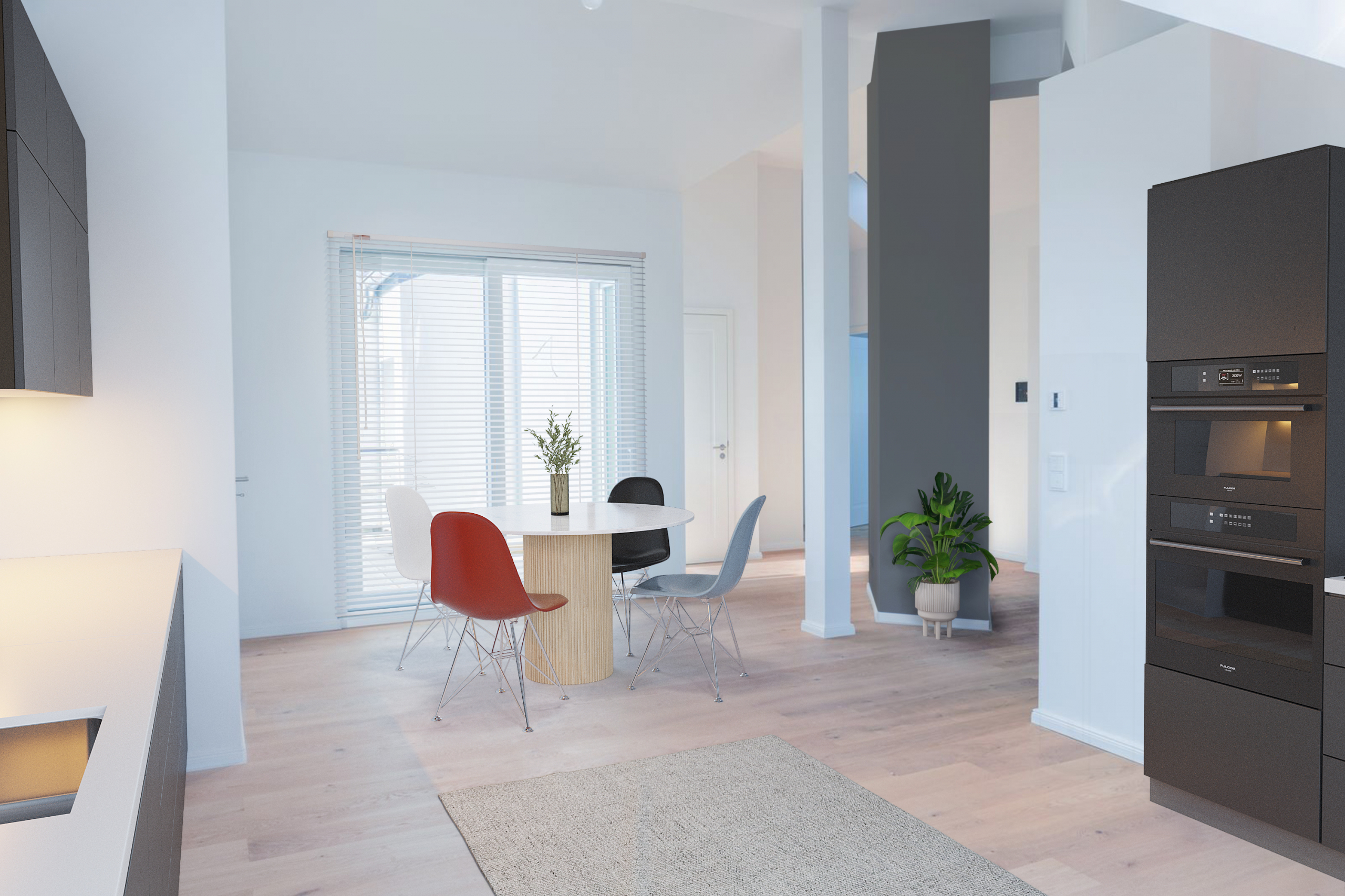 Die Wohnung wurde gerade fertiggestellt und besticht durch hochwertige Materialien und eine durchdachte Raumaufteilung. Das absolute Highlight ist der weitläufige Wohn- und Essbereich  im Eckzimmer und die daran angeschlossene offene Küche.