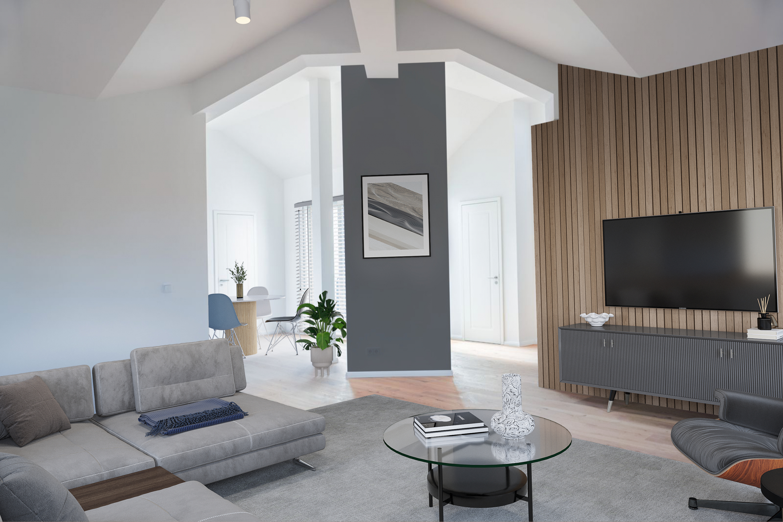 Die Wohnung erstreckt sich über eine großzügige Fläche von 138,07 m² und bietet zwei geräumige Schlafzimmer und einen über 60 m2 großen Wohn- und Essbereich mit offener Küche. Der Grundriss bietet die Möglichkeit eine Kochinsel oder einen Tresen einzubauen.