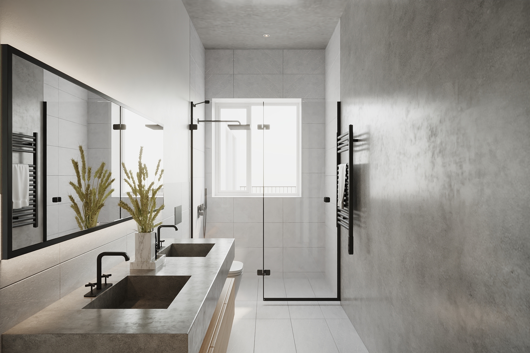 Das Badezimmer verfügt über eine moderne Dusche und stilvolle Fliesen, die für eine elegante Optik sorgen.