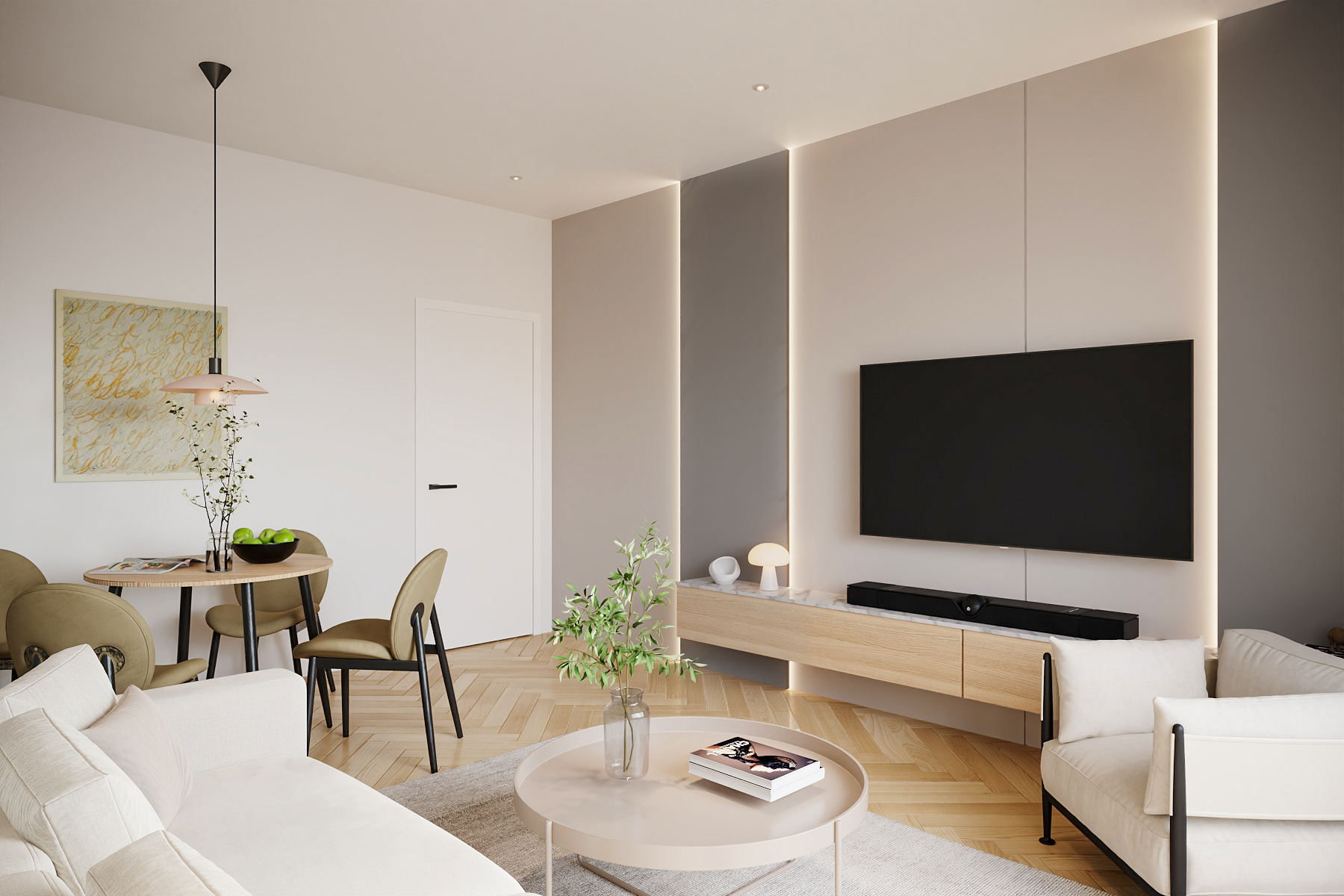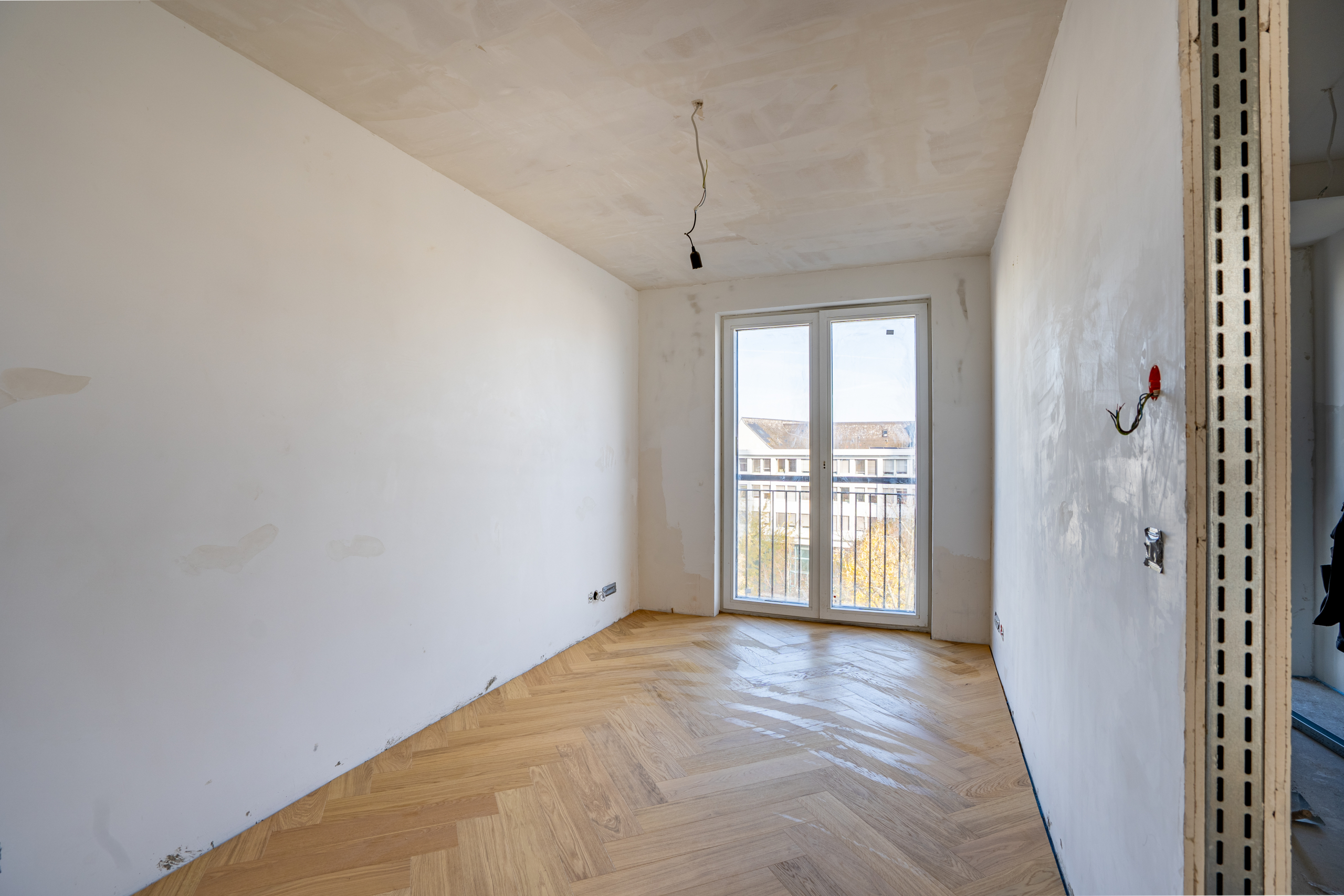 Ein einladender Flur bildet den Auftakt und führt auf kurzem Weg in alle Räume. Der Wohnbereich mit Zugang zum sonnigen Südbalkon öffnet sich durch bodentiefe Fenster zur Stadt hin und wird von Licht durchflutet. Zwei ruhige Schlafzimmer bieten vielseitige Nutzungsmöglichkeiten – sei es als Rückzugsort, Arbeitszimmer oder stilvoller Gästebereich.