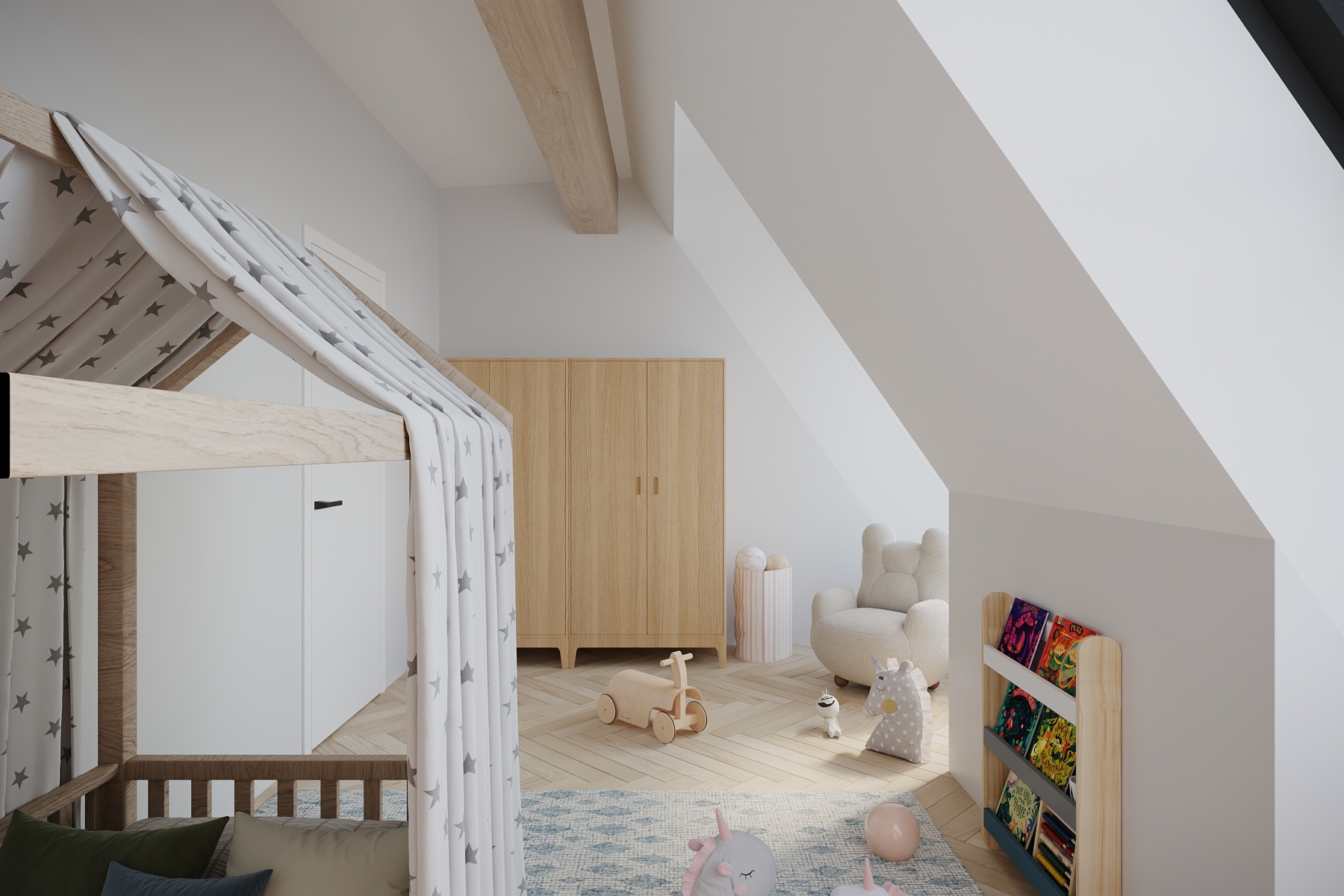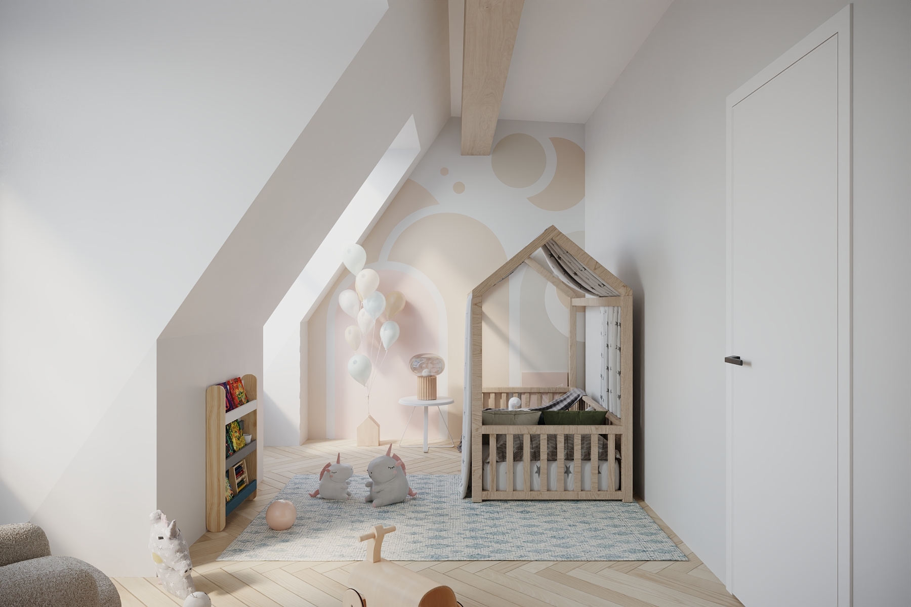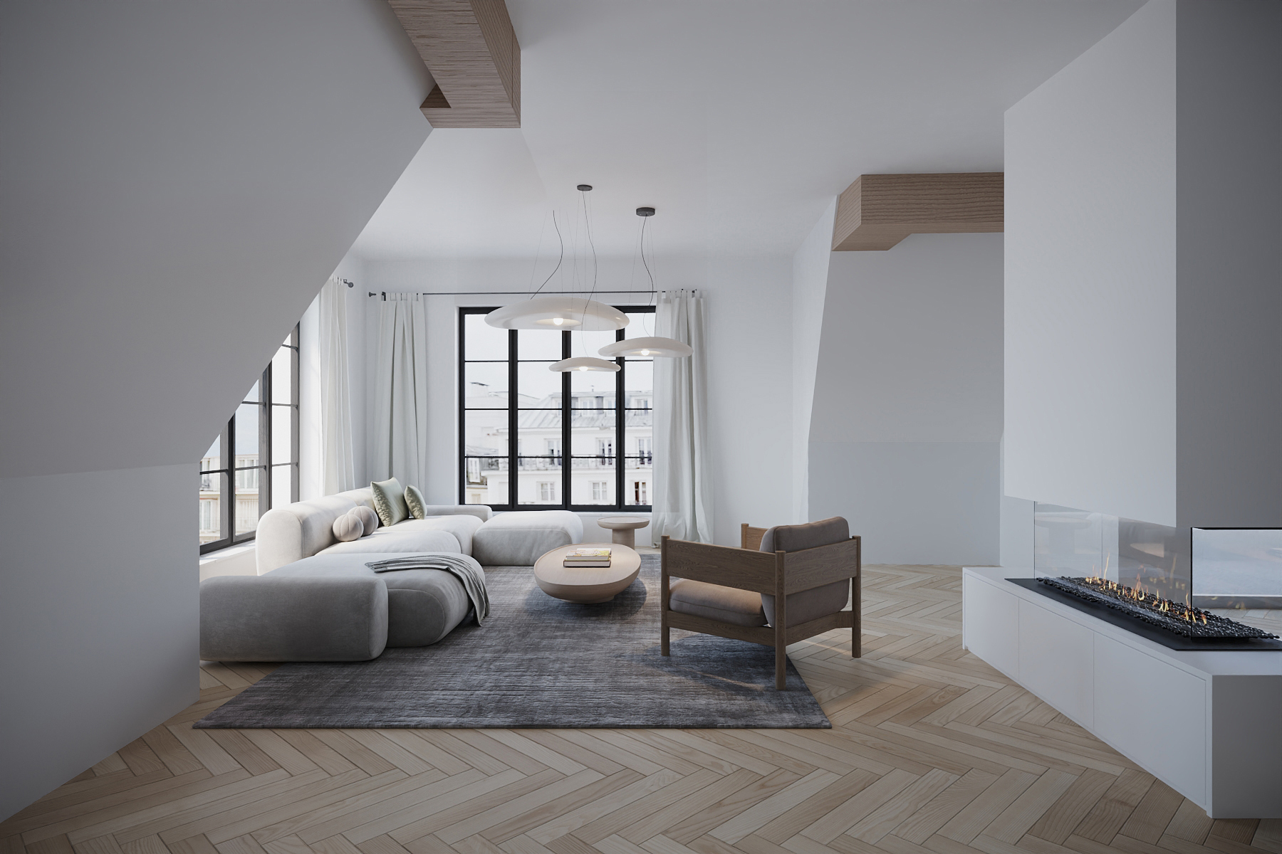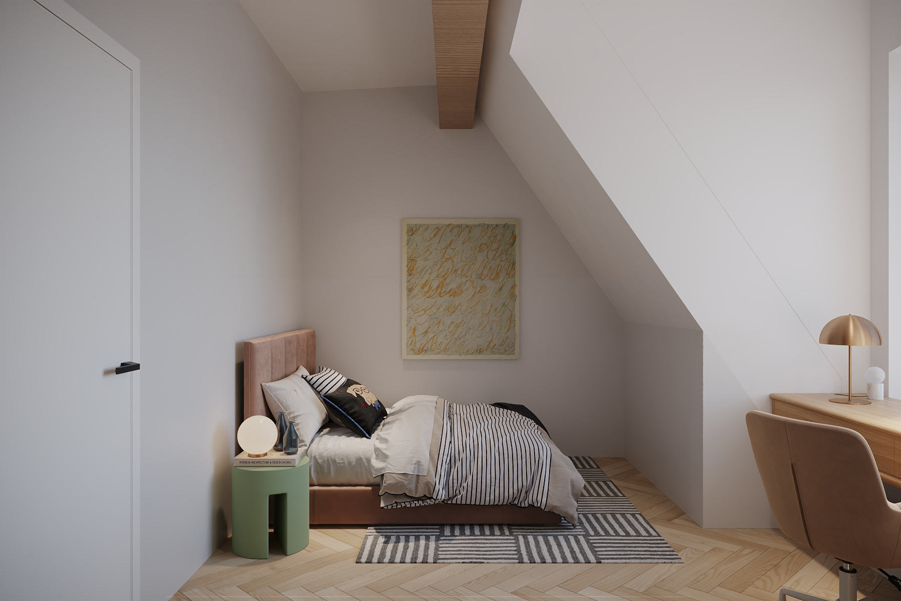 Auf über 300 Quadratmetern Wohnfläche entfaltet sich eine Atmosphäre, die man nicht in Quadratmetern misst, sondern in Momenten: beim ersten Schritt auf das warme Fischgrätparkett, beim Blick auf die freigelegten Dachbalken, die mit der Geschichte des Hauses flüstern, oder wenn das Licht der Stadt durch die großzügigen Dachfenster in den offenen Wohnbereich fällt. Alles wirkt leicht, offen und dennoch voller Substanz – ein stimmiger Dialog zwischen Historie und moderner Klarheit.